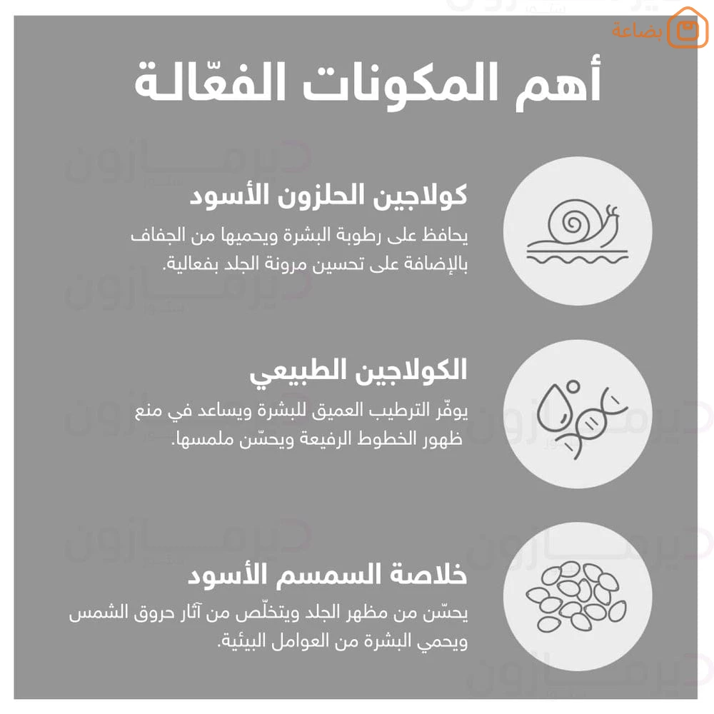 مستحلب كولاجين الحلزون الأسود يرطب بعمق، يشد البشرة، يحمي من الشيخوخة، ويعزز مرونتها لجميع أنواع البشرة.