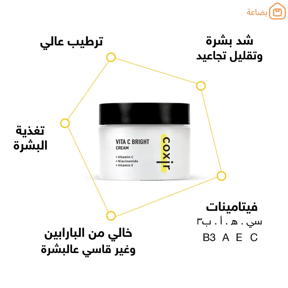 كريم فيتا سي برايت يرطب البشرة، يحسن توحيد اللون، يمنع علامات التقدم في السن، يناسب جميع أنواع البشرة، يشد الجلد ويقلل التجاعيد، غني بالفيتامينات المغذية.